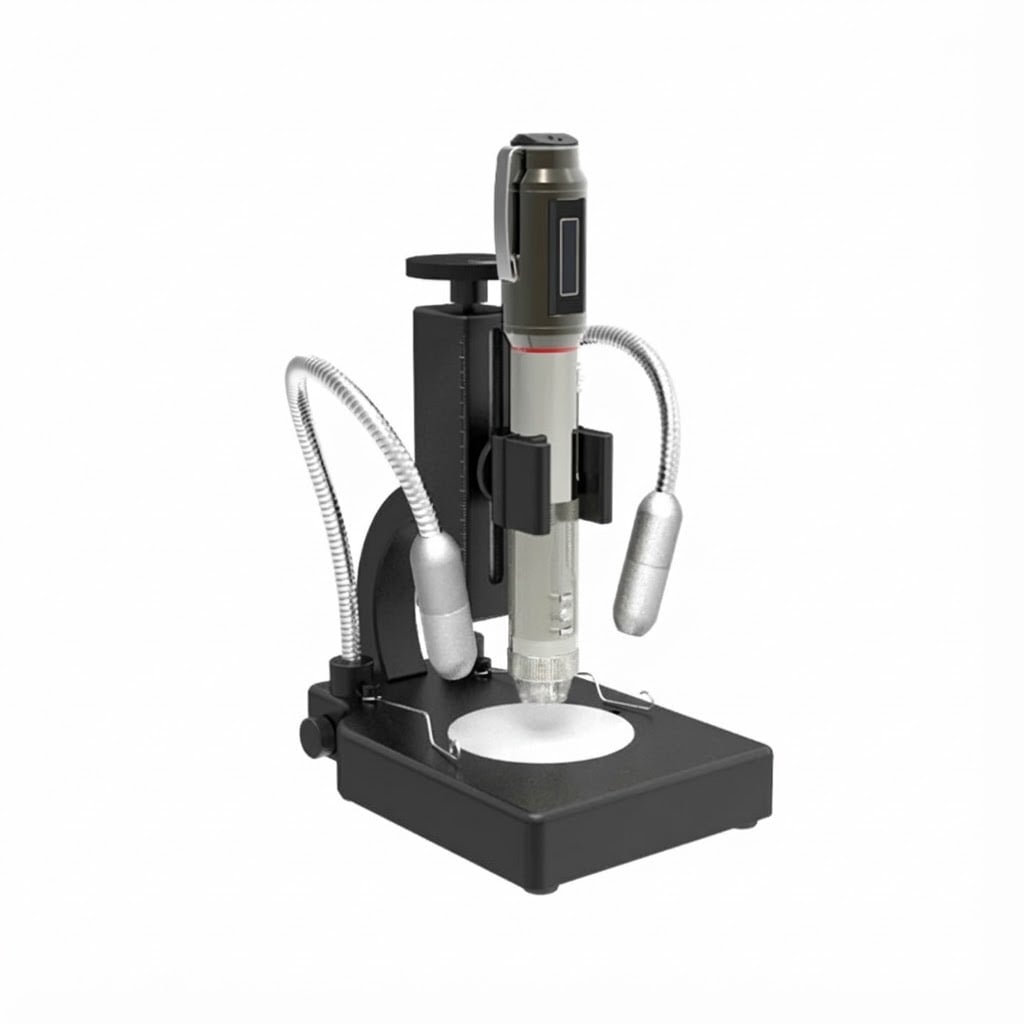 Stand with dual flexible lighting to reduce surface reflections and observe liquid samples using bottom illumination.